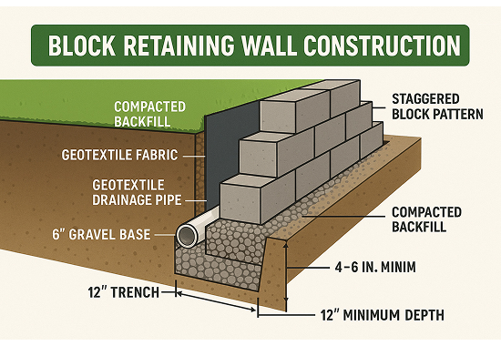 South Shore properties deal with moisture, wind, and hillside issues more than most. That’s why concrete block systems are ideal – they don’t rot, warp, or fade quickly. With proper reinforcement and drainage, these walls can last decades with little maintenance.