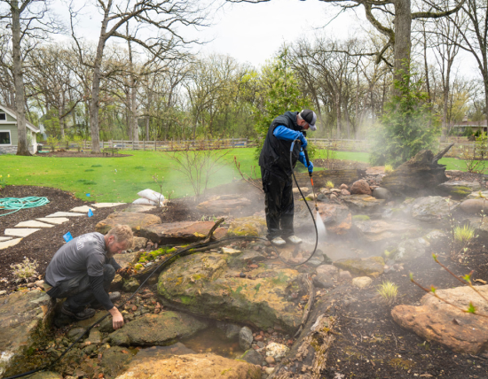 In Lunenburg, we clean and maintain stone features created by a Lunenburg stone water feature builder, using methods that protect natural surfaces. Chester properties often feature larger rock elements, and we frequently service landscapes designed by a Chester custom boulder landscaping company, where proper cleaning helps preserve the original look.